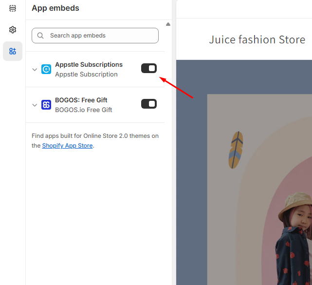 Go to **Themes** > **Customize** > **App Embeds**, then toggle on **Appstle** to activate it.